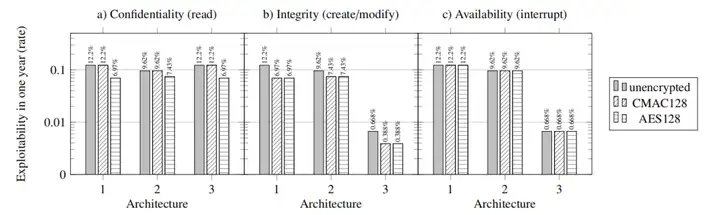 图 5、图 4 所示架构的分析结果。我们针对三种架构,结合不同的保护机制(未加密、128 位 CMAC、128 位 AES),从机密性、完整性和可用性三个维度对消息 m 进行了分析。结果清晰表明,更优质的加密方式和设计更严谨的架构具有更低的被利用风险;而在可用性方面,需要总线系统的支持才能确保合理的安全性