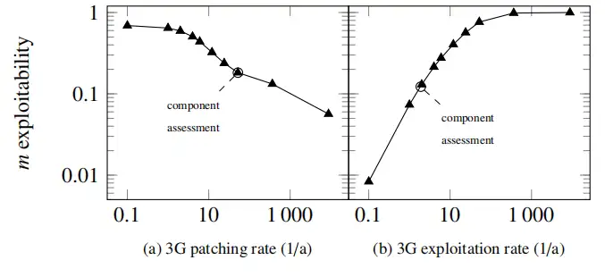 图 6、参数探索示意图,用于评估(参数)对整个架构安全性的影响。(a)中对入口点的补丁更新率进行了调整;(b)中为构成车辆攻击起点的远程信息处理电子控制单元(3G)采用了不同强度的安全防护措施
