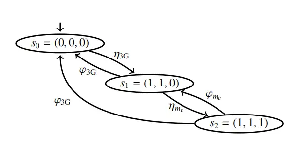 示例:为了说明这一过程,考虑一个简单的架构 ------ 远程信息处理电子控制单元(3G)连接到 CAN 总线(参见图 1 中的 3G)。CAN 总线用于传输消息 m,该消息既不由远程信息处理电子控制单元发送,也不被其接收。将该架构转换为马尔可夫模型后,得到如图 3 所示的模型。这是一个非常简化的转换,未考虑所有电子控制单元、接口或消息状态,且每个模块仅考虑一个漏洞。