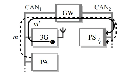 在现有方法中,车辆网络通过外部接口处的防火墙来保障安全性,但内部安全性往往未被纳入考虑范围。一旦防火墙被攻破,攻击者便可自由访问整个网络。图 1 展示了这样一个潜在的攻击场景。