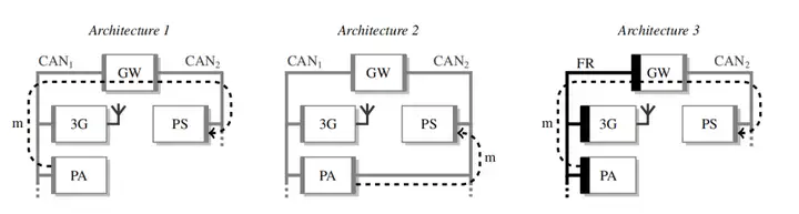 图 4、用于比较不同安全方案的三种架构。架构 1 中,消息 m 与远程信息处理单元(3G)在同一条总线上传输;架构 2 为消息 m 增设了专用连接;架构 3 引入 FlexRay 总线用于消息 m 的传输