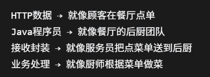 顾客(客户端) → 服务员(Controller) → 后厨(Service) → 菜品(响应)