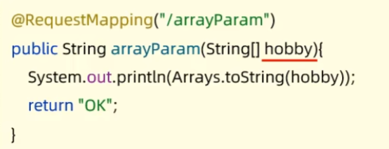 数组参数:请求参数名与形参数组名称相同且请求参数为多个,定义数组类型形参即可接收参数