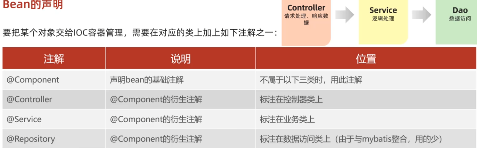 使用以上四个注解都可以声明bean,但是在springboot集成web开发中,声明控制器bean只能用@Controller.