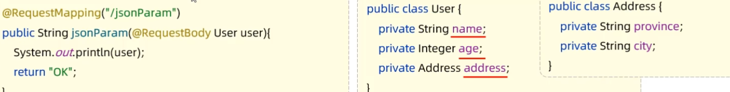 JSON参数:JSON数据键名与形参对象属性名相同,定义POJ0类型形参即可接收参数,需要使用@RequestBody标识