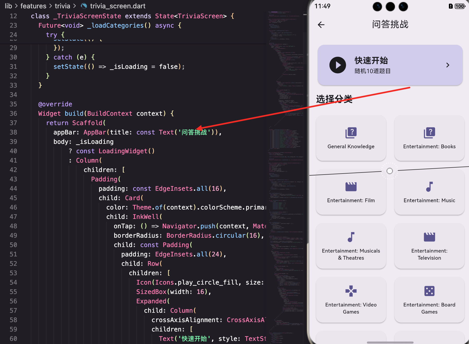 TriviaScreen是主页面,展示分类选择和快速开始选项: