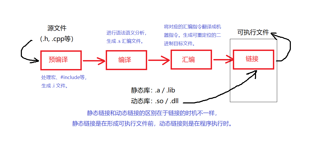 C/C++程序从源码到可执行文件的完整流程 :预处理 → 编译 → 汇编 → 链接;