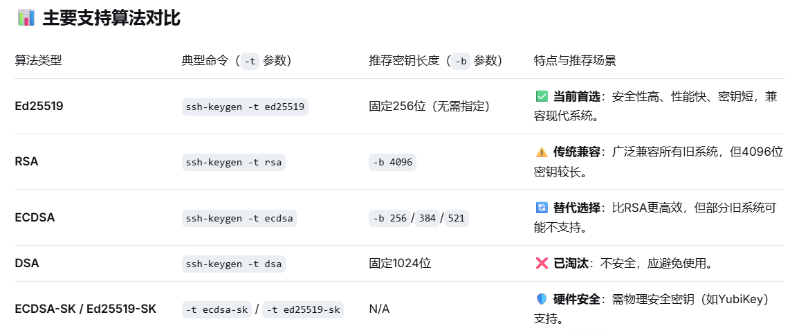 ssh-keygen 支持多种密钥算法,其中Ed25519 和RSA是目前最常用和推荐的选择。以下是详细的算法列表和选择建议: