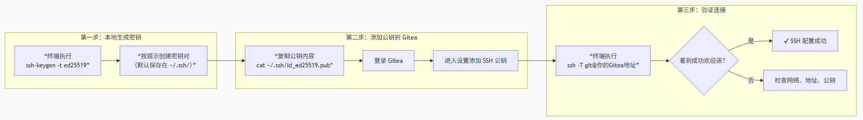 为 Gitea 设置 SSH 连接,主要分为本地生成密钥 和在 Gitea 上添加公钥两个核心步骤。