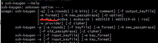 查看系统支持的算法,可以用ssh-keygen --help,-t选项会显示支持的算法