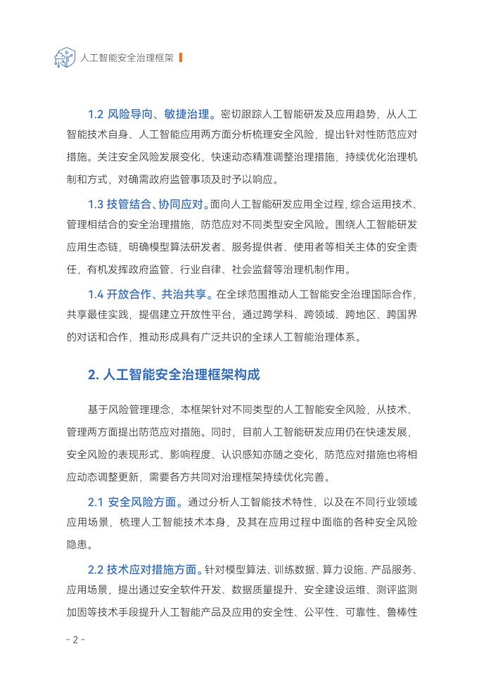 《人工智能安全治理框架》2.0版于2025年9月15日发布[1][4][5],由国家互联网应急中心牵头制定,秉持"以人为本、智能向善"理念,强化风险识别精细化,提升动态适应能力,为全球治理贡献中国方案[6]。