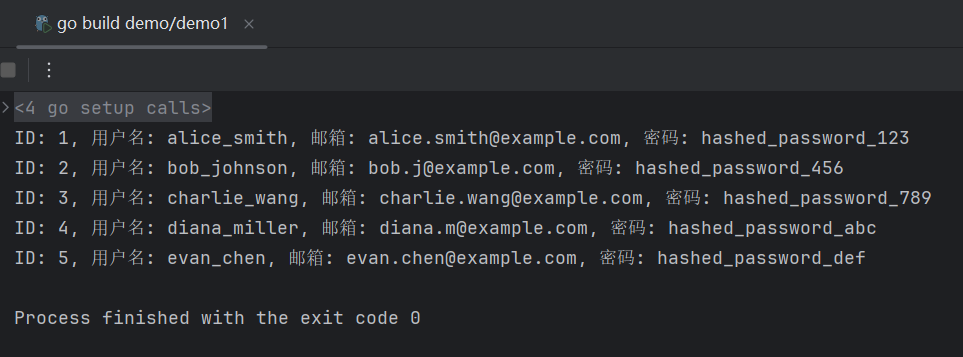 fmt.Printf("ID: %d, 用户名: %s, 邮箱: %s, 密码: %s\n",
