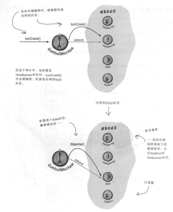 我们打算把状态对象封装进它们的类,让后在动作发生时让机器类委托给当前状态。在这里,我们遵循以下设计原则,因此最后应该得到一个更容易维护的设计。我们打算这么做: