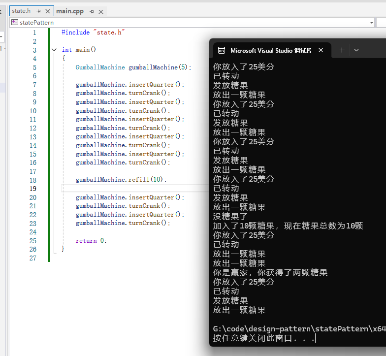 在代码中我们加入了赢家状态,并且在有25分钱状态里我们在转动把柄后用随机数判断是不是赢家,进而跳转到不同的状态。另外还新增了refill方法,支持往机器中加入更多糖果。