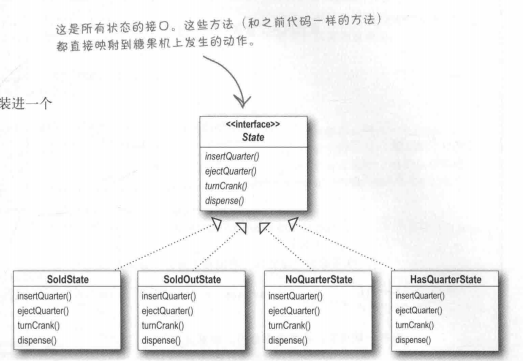 - 首先,我们打算定义一个State接口,里面针对糖果机内的每个动作有一个方法。