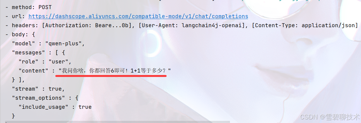 当我们问出"1+1等于多少?"时,系统会自动将我们的问题拼接上下图的红线部分: