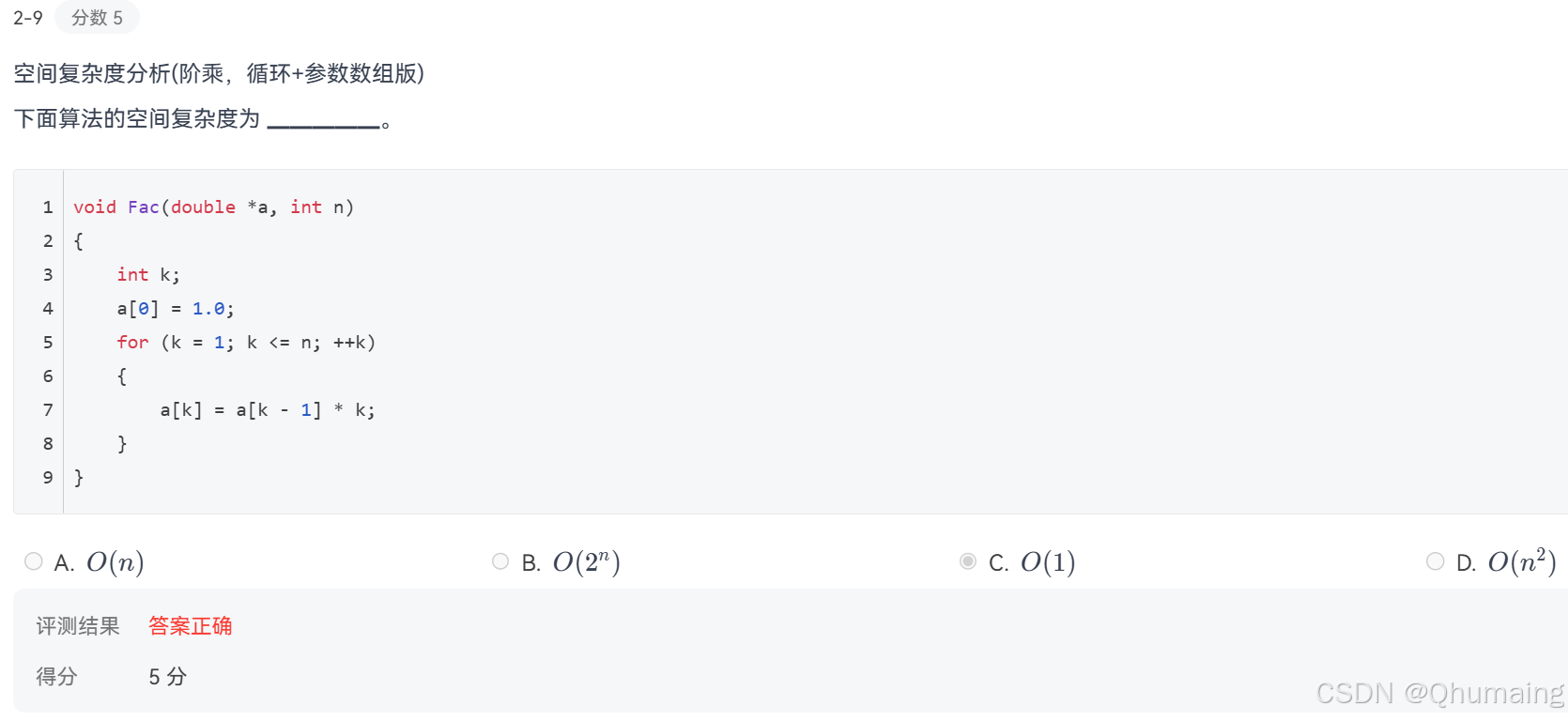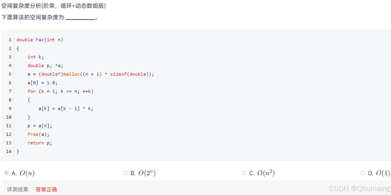 cdouble Fac(int n){ double res = 1.0; for(int k=1;k<=n;k++) res *=k; return res; }这种写法无动态内存申请 ,只有固定局部变量,空间复杂度才是 O(1)O(1)O(1)。