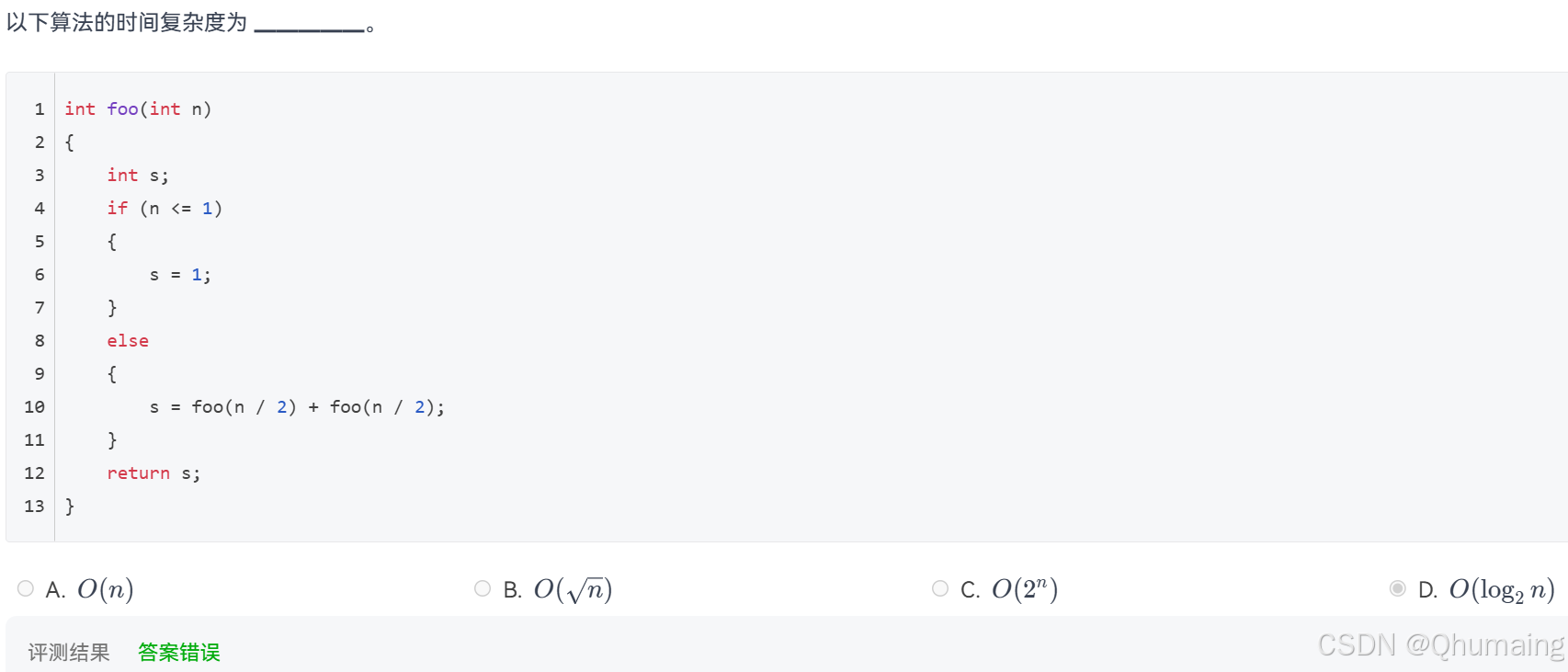 ✅ 本题答案:O(log2n)\boldsymbol{O(\log_2 n)}O(log2n),选择 B 选项