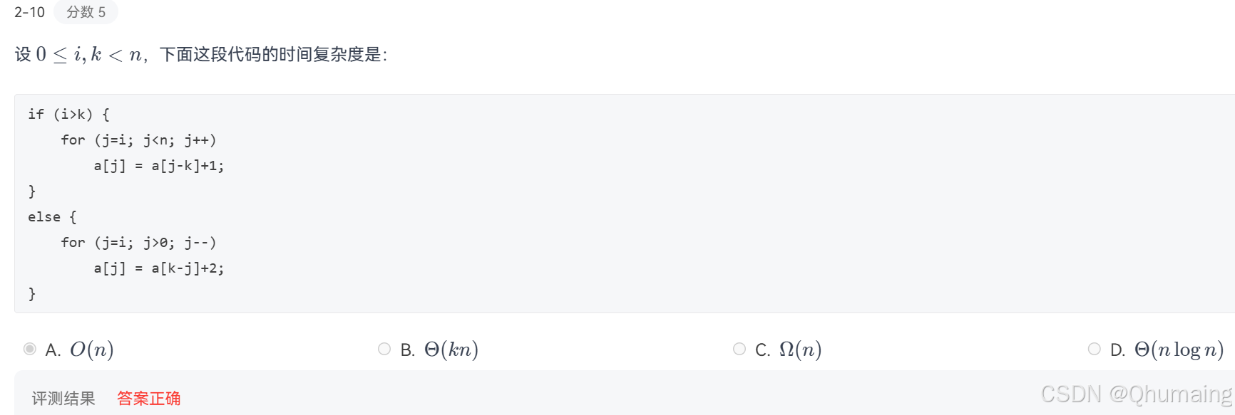 这是本题最大的坑 ,很多人会误选B选项 Θ(kn)\Theta(kn)Θ(kn),原因是看到代码里有变量kkk就误以为是k×nk×nk×n的复杂度,这里给出铁律结论: