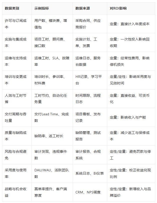 ROI数据分为成本类与收益类,并辅以采用度与风险校正数据。 成本侧含许可与订阅、实施与集成、运维与支持、培训与变更;收益侧含人效提升与工时节省、交付周期与吞吐量、质量与缺陷成本、风险与合规避免;校正与加值侧含采用度与使用率、战略价值与机会收益。在实际采集中,建议以"业务主表+度量明细表+证据库"三件套管理数据,以便审计与复算。
