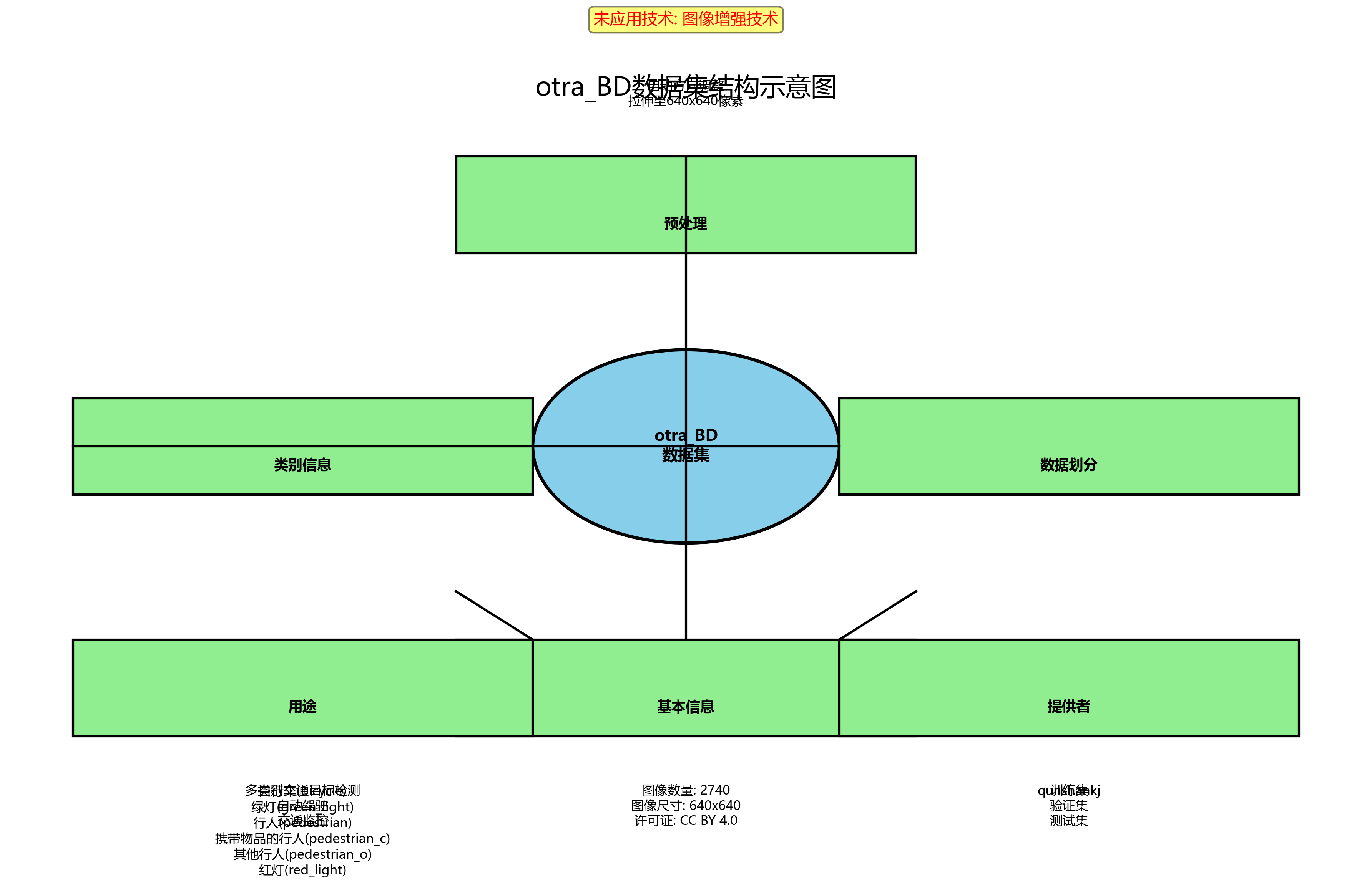 otra_BD数据集是一个用于多类别交通目标检测的数据集,由qunshankj用户提供,遵循CC BY 4.0许可证。该数据集包含2740张图像,所有图像均经过预处理,包括自动方向调整(剥离EXIF方向信息)和拉伸至640x640像素尺寸,但未应用任何图像增强技术。数据集采用YOLOv8格式进行标注,包含六个类别:自行车(bicycle)、绿灯(green_light)、行人(pedestrian)、携带物品的行人(pedestrian_c)、其他行人(pedestrian_o)以及红灯(red_light)。数据集被划分为训练集、验证集和测试集,适用于训练和评估交通场景下的多目标检测模型。该数据集的创建目的是支持计算机视觉项目,特别是针对复杂交通环境中的多种目标检测任务,为自动驾驶、交通监控等应用提供基础数据支持。