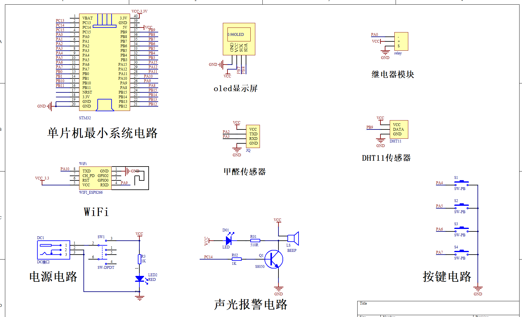 本设计由STM32F103C8T6单片机+WIFI模块ESP8266-01S电路+OLED屏幕电路+DHT11温湿度传感器电路+甲醛传感器电路+继电器模块电路+蜂鸣器电路+按键电路+电源电路。