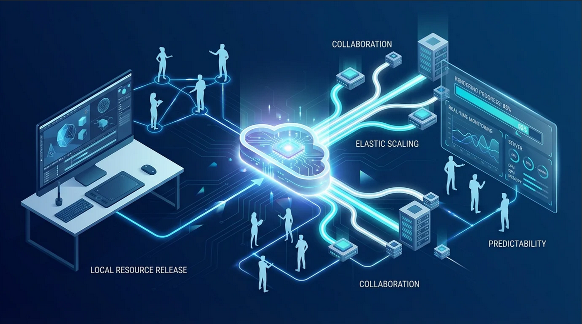 云渲染的核心思想,是将高强度计算任务从本地设备迁移至云端服务器集群完成。相较于传统本地渲染,其在动画制作中具备明显优势: