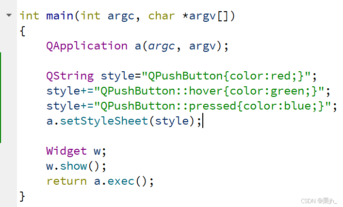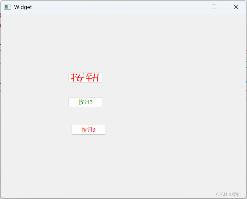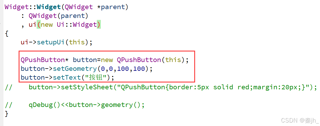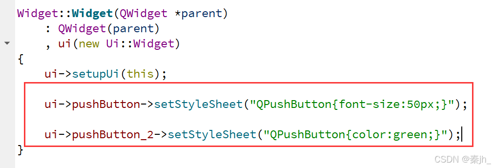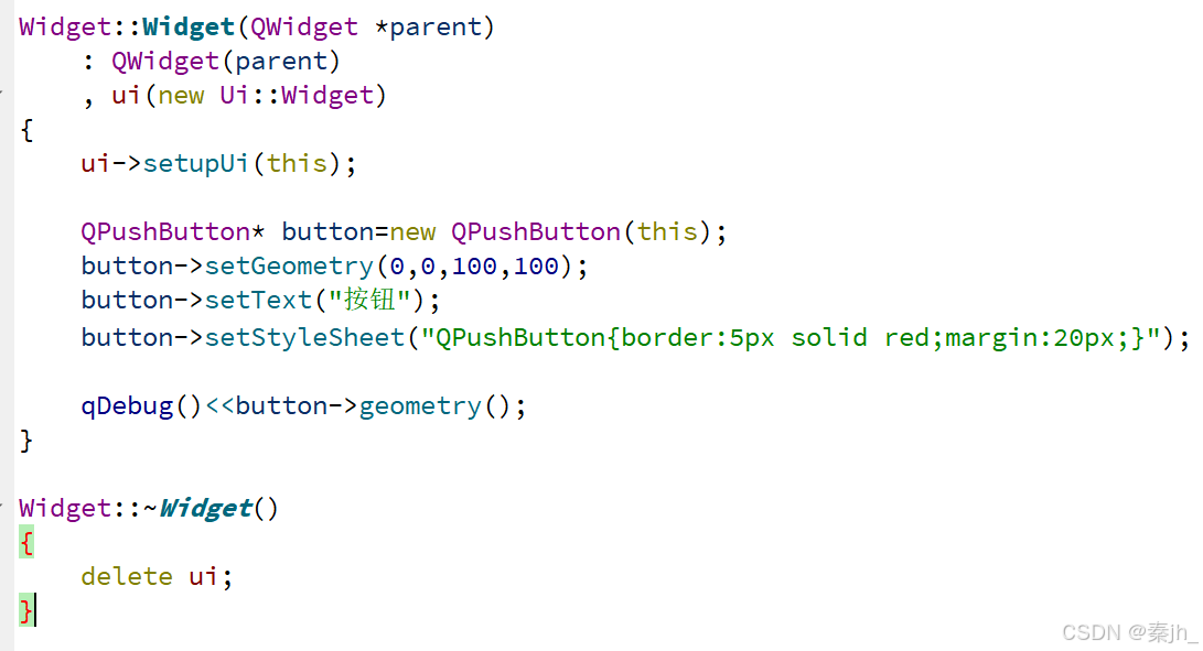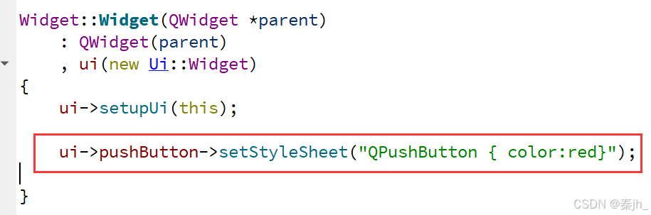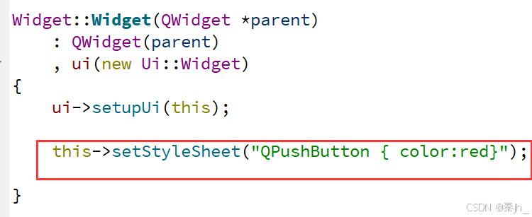 修改widget.cpp,这次我们不再给按钮设置样式,⽽是给Widget设置样式(Widget是 QPushButton的⽗控件).