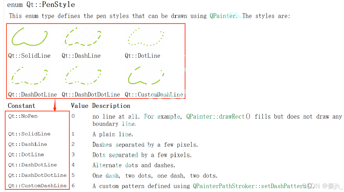 - 设置画笔⻛格:void QPen::setStyle(Qt::PenStyle style)
