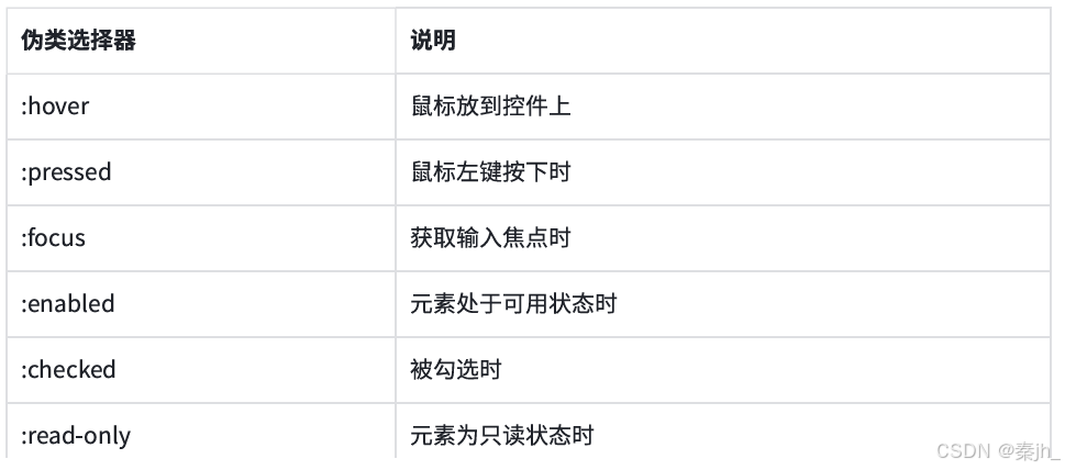 伪类选择器,是根据控件所处的某个状态被选择的.例如按钮被按下,输⼊框获取到焦点,⿏标移动到某 个控件上等