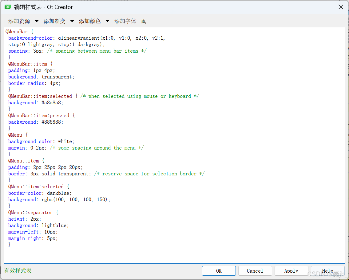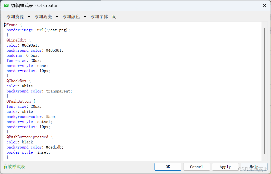 Qt 仿照CSS的模式,引⼊了QSS,来对Qt中的控件做出样式上的设定,从⽽允许程序猿写出界⾯更好看 的代码.