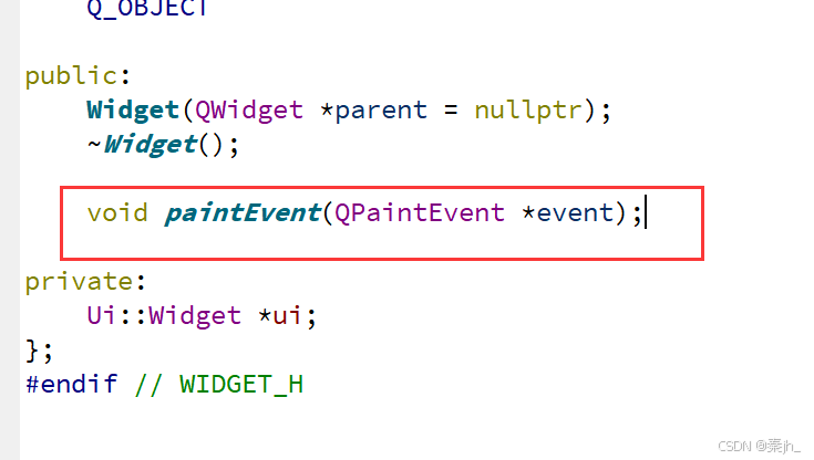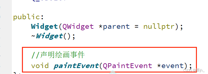 在"widget.h"头⽂件中声明绘画事 件;如下图⽰: