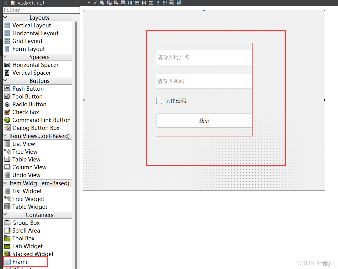 把上述控件添加⼀个⽗元素QFrame,并设置QFrame和窗⼝⼀样⼤