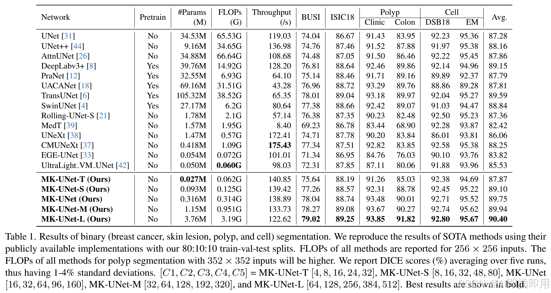 数据集多样性:论文在 乳腺癌(BUSI)、皮肤病变(ISIC18)、息肉(ClinicDB/ColonDB)、细胞核(DSB18/EM) 等 6 个差异巨大的数据集上进行了验证,证明了模型的泛化能力。