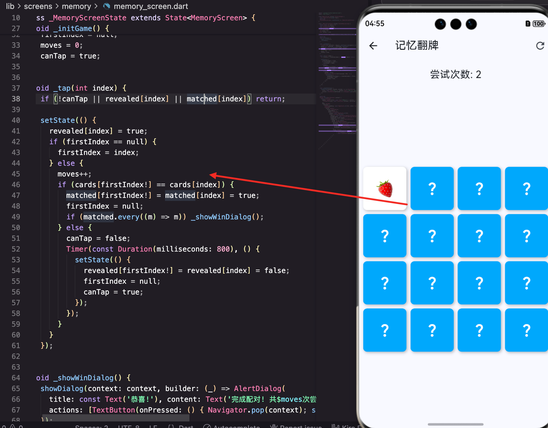 - 状态变量: revealed、matched、firstIndex、canTap、moves各有作用