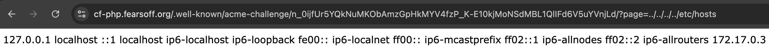 许多 PHP 应用程序通过 index.php 路由所有请求,并使用查询参数选择视图。当该模式携带 LFI bug 时,公共可达性会将其转化为文件读取。请求 .../.../.../.../etc/hosts 就足以证明影响。在我们的演示中,即使是 404 流程也通过 index.php 路由,这就是为什么一旦源站开始直接说话,它就会暴露额外页面。