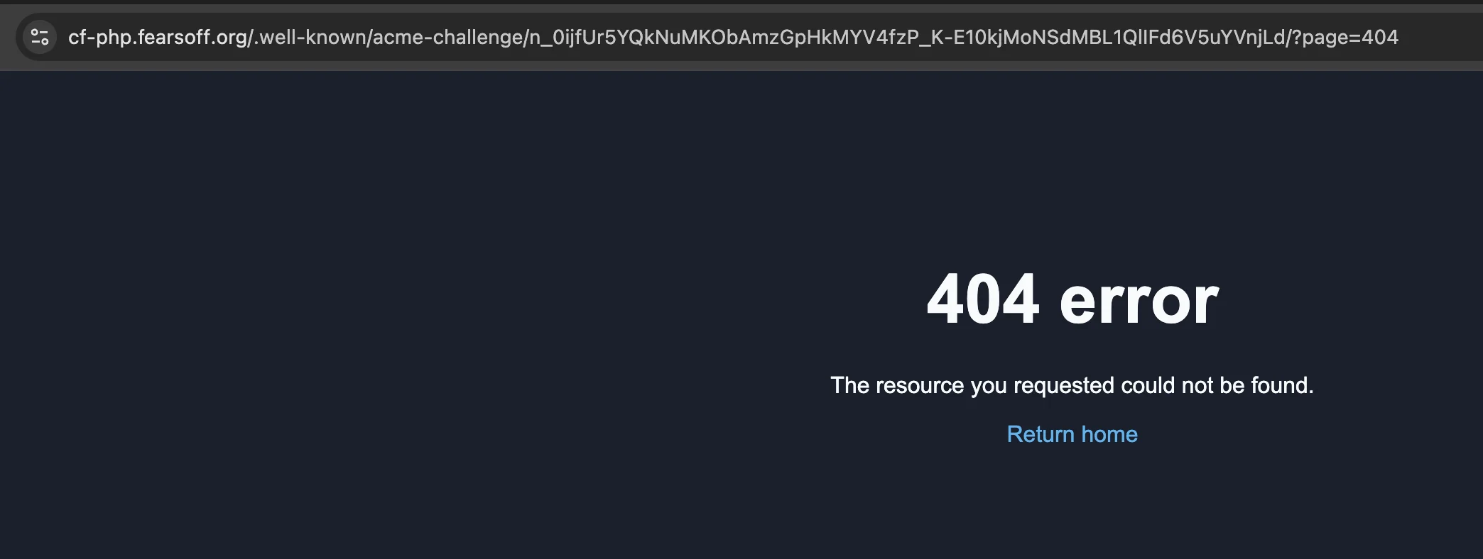 或者,当 .well-known 远远超出 WAF 的范围。几乎所有现代网站上都存在一个专为机器而非人类设计的 URL。它位于 /.well-known/acme-challenge/ 下,在证书颁发期间的几秒钟内,一个机器人会访问它来检查你是否真正控制该域名。这个访问本应是平淡无奇的,一项例行无声的任务。但在这种情况下,这个安静的路径变得非常喧闹!