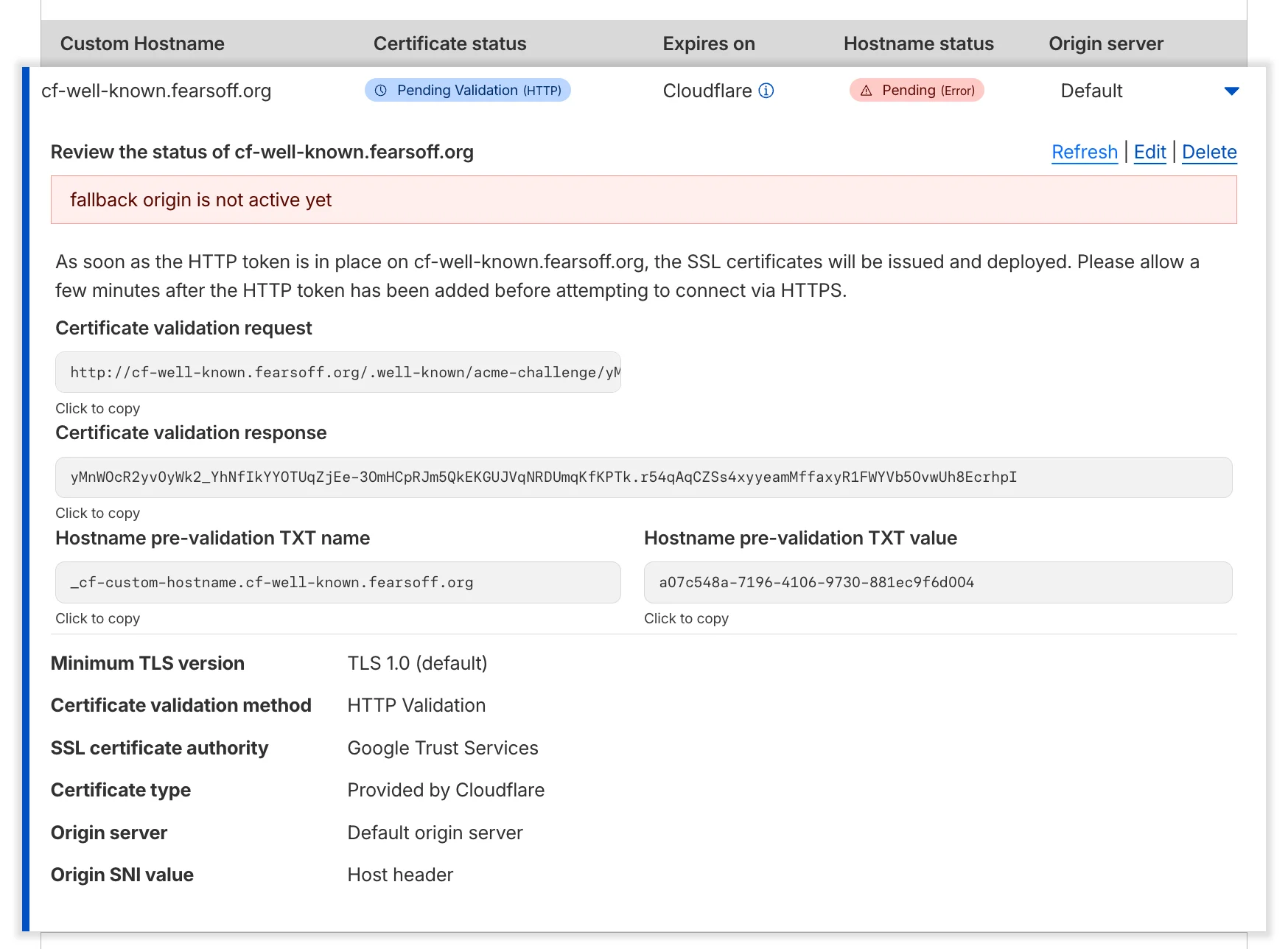 我们故意没有为 cf-well-known.fearsoff.org 创建 DNS 记录,因此颁发保持无限期挂起。在挂起状态下,Cloudflare 会显示验证机器人最终会请求的 HTTP-01 URL,例如: