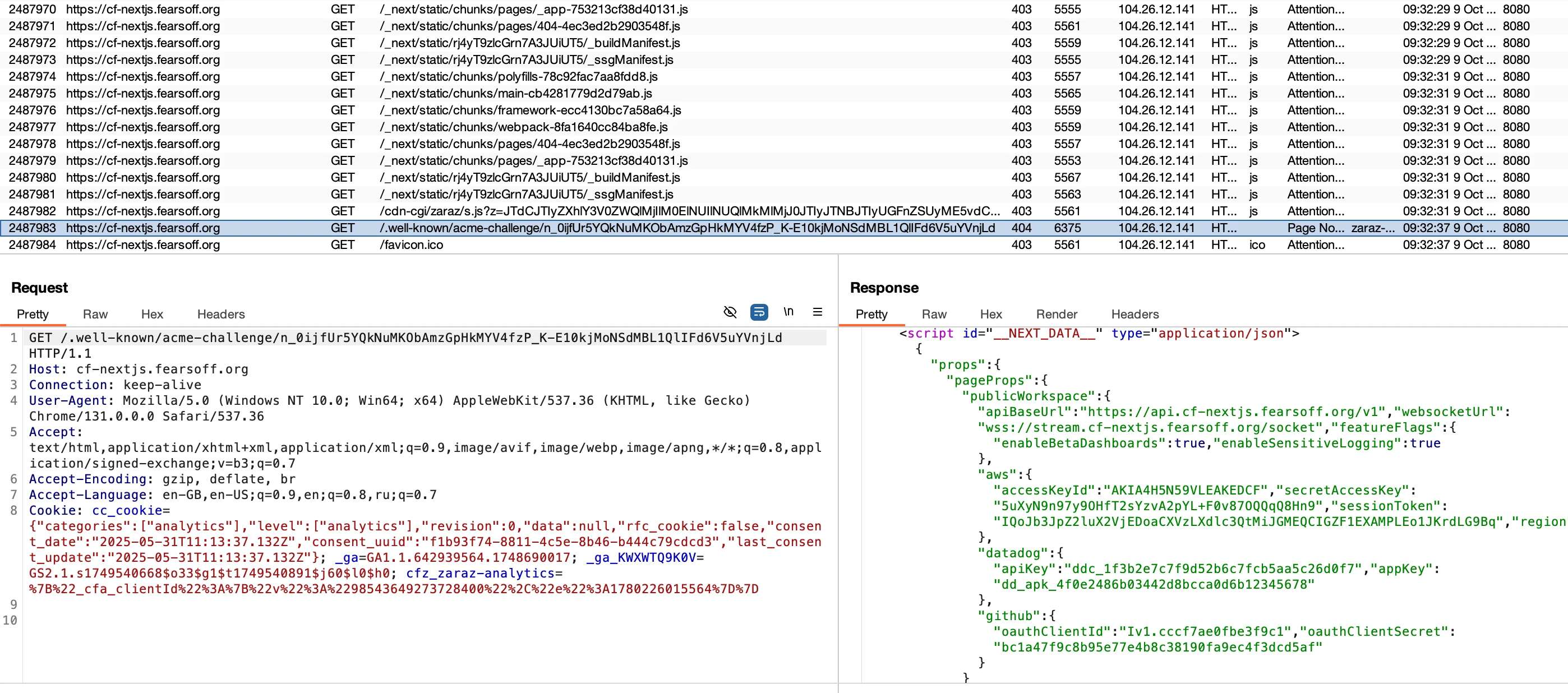 服务器端渲染框架通常将服务器派生的值发送到客户端以水合页面。当 WAF 拥有前门时,这是没问题的。当源站直接响应时,同一页面可以暴露从未打算从公共互联网可达的操作细节。