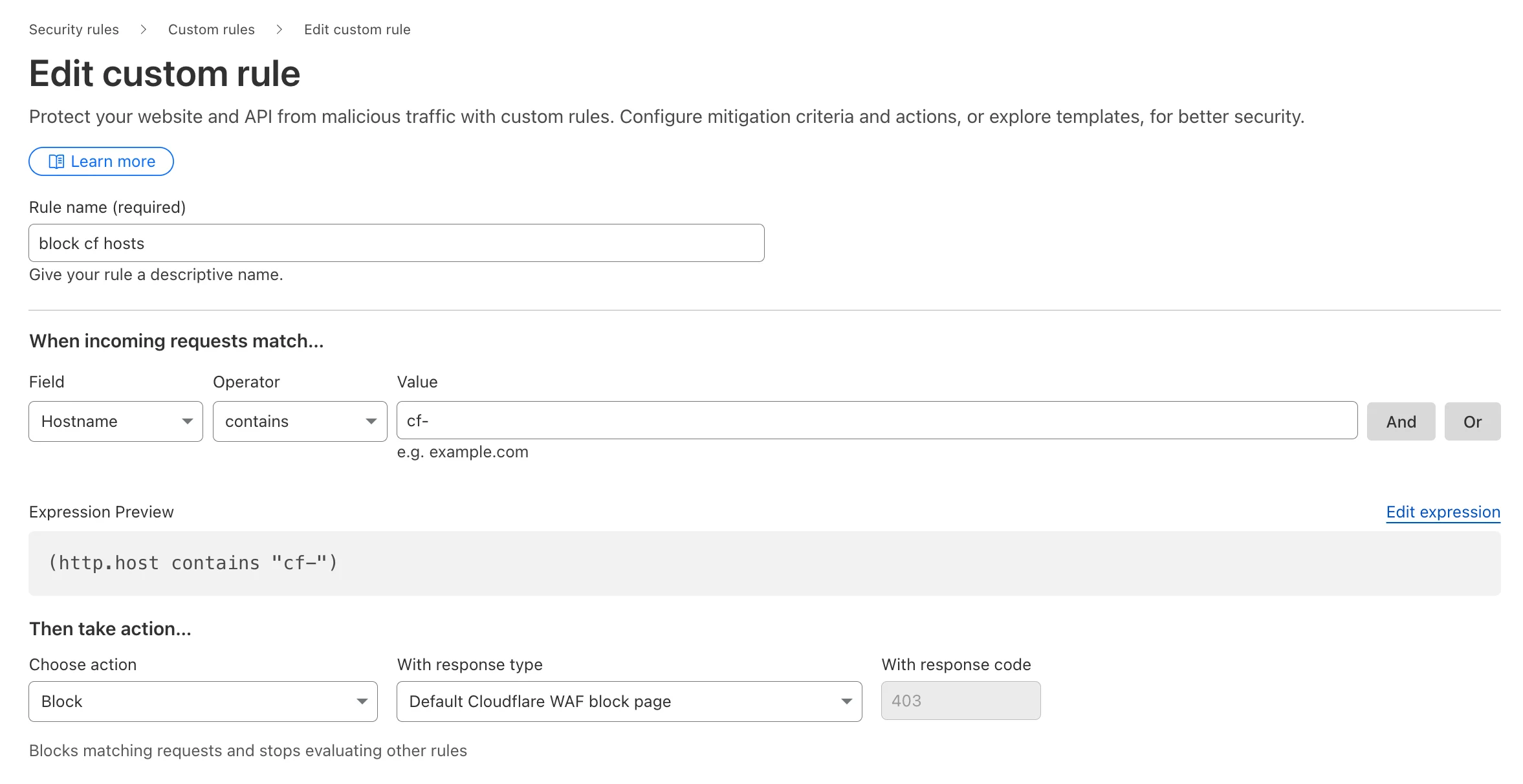 在演示中,我们创建了一个规则,阻塞任何包含 cf- 的主机名。在生产环境中,许多团队阻塞公共互联网,只允许公司 VPN 出口。此规则模拟了演示的态势。