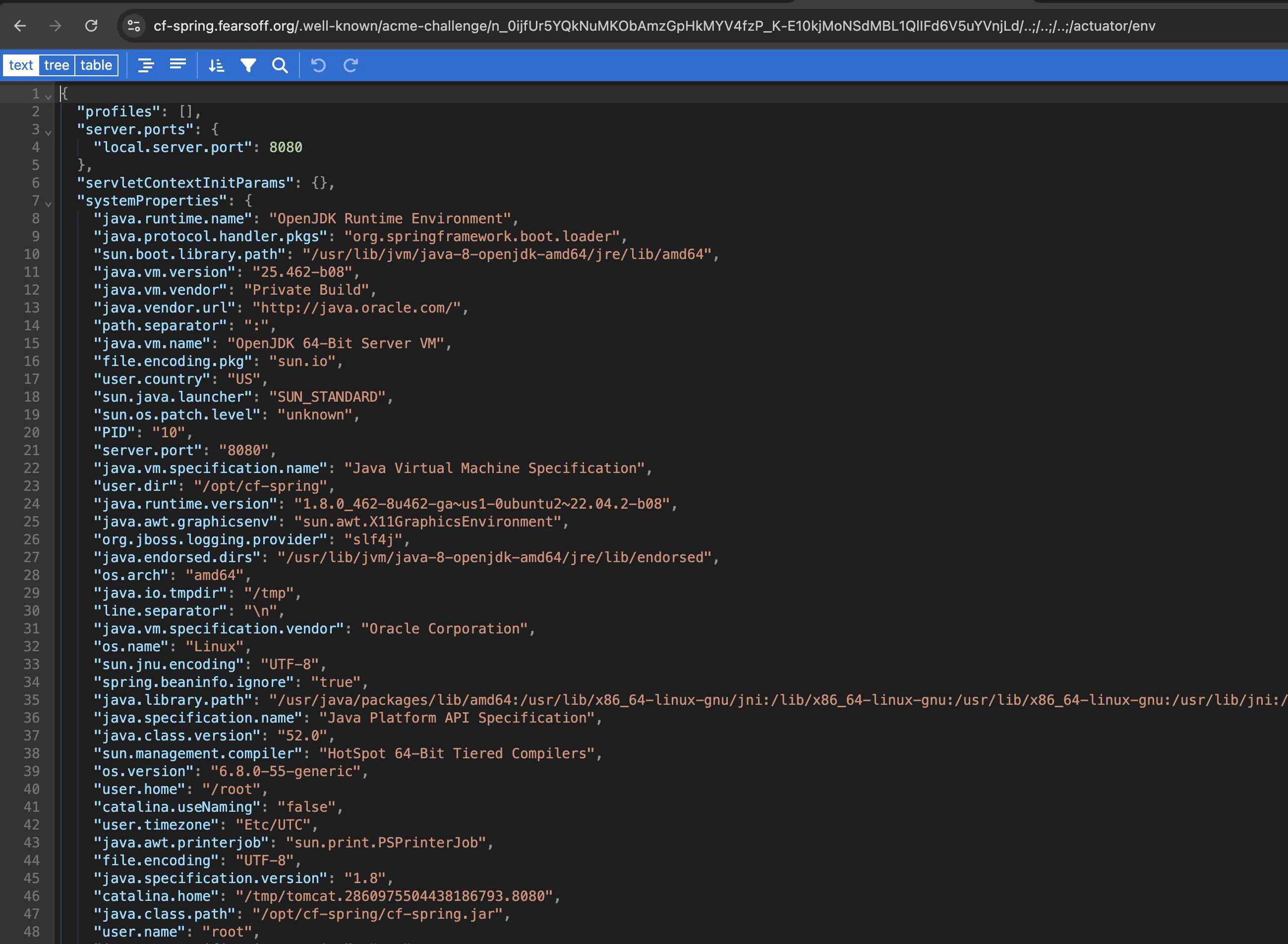 在正常态势下,actuator 端点位于 WAF 和内部网络控制后面。通过 ACME 路径到达应用程序改变了该边界。使用某些 servlet 栈中著名的遍历 quirk ( ...;/ ),请求可以落在 /actuator/env 上并返回进程环境和配置。这些数据通常包括敏感值------数据库 URL、API 令牌、云密钥------它实质上提高了源站中任何错误的爆炸半径。