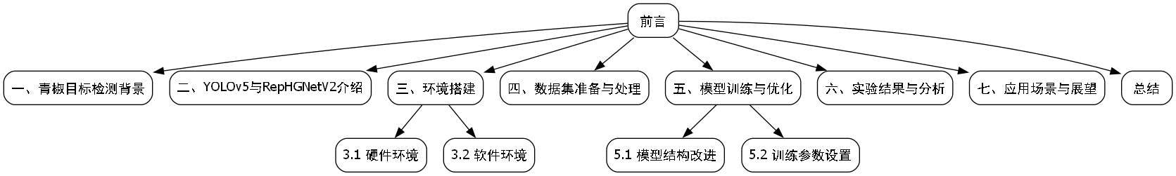 本文详细介绍了基于YOLOv5-RepHGNetV2的青椒目标检测方法研究。从背景介绍、环境搭建、数据集准备到模型训练与优化,我们一步步构建了一个高效准确的青椒目标检测系统。实验结果表明,改进后的模型在各项指标上均优于原始YOLOv5模型,特别是在复杂场景下的检测能力显著提升。