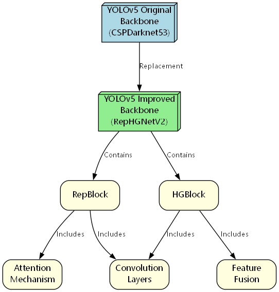 我们用RepHGNetV2替换了原始YOLOv5的CSPDarknet53主干网络。RepHGNetV2的核心结构包括: