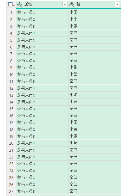 然后删除"属性"列,对人名一列进行去重,就得到所有项目所有参与人员的名单了。