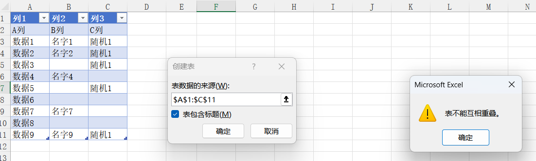 我又想对整个数据区域进行分析,但我引用时却报错"表不能相互重叠",简单来说:当你试图在Excel中创建多个来自相同区域的数据查询时,如果这些查询指向的源数据范围有交叉或重复,Excel就会提示这个错误。