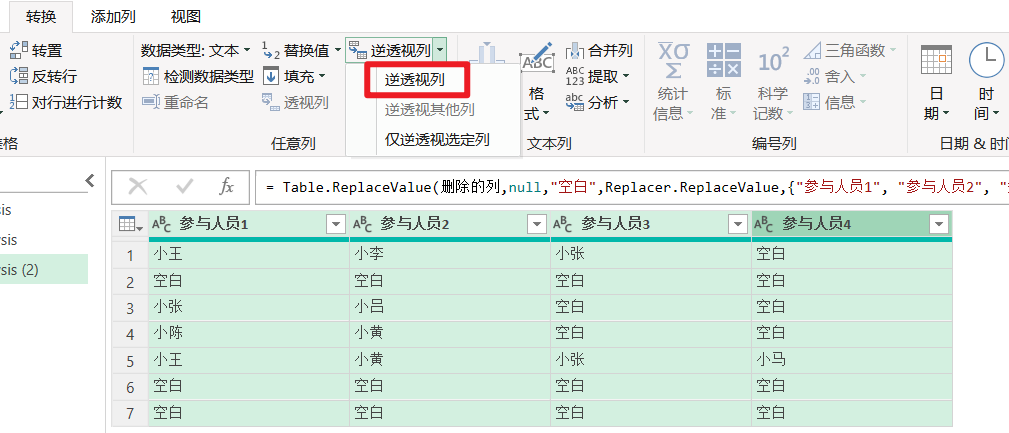 结果如下,多列摊平成两列(逆透视)的意思就是,标题行单独一列(属性),其余的全部为一列(对应属性的值。