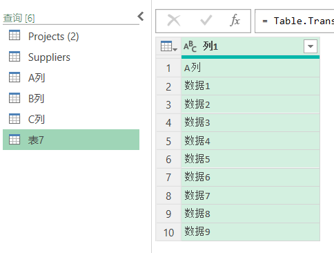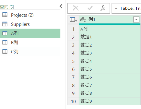 比如我有一个源数据表如下,我想对A、B、C三列分别做数据分析,所以分别选择ABC三列,就会生成三个"查询"