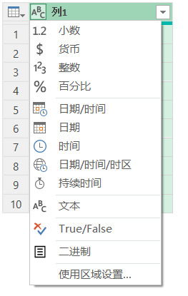 PQ有自己的数据类型,该列的数据类型显示在列头,如图,点击这个地方可以更改该列的数据类型。
