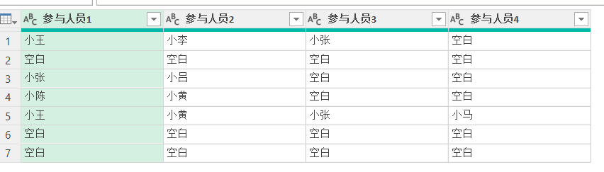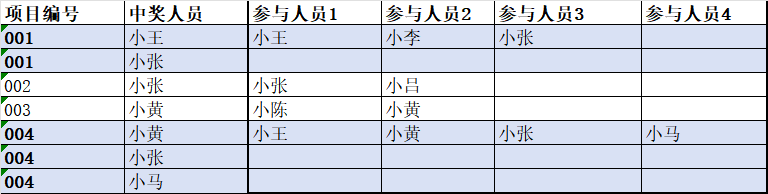 比如我有这样一个表格的结构,不同项目的中奖和参与人数不一样,我现在想要所有项目所有参与人员的名单, 但是参与人员有4列n行。